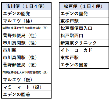 ご入居者様は、JR市川駅や松戸駅、近隣の病院・商業施設などの周辺施設を送迎する「エデンバス」を無料でご利用いただけます。