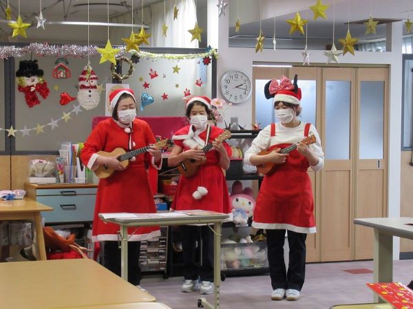 サンタやトナカイに扮したスタッフがまずはウクレレの演奏でおもてなし。