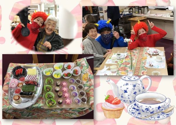 同じテーブルの方とのお喋りにも花が咲いたところに、この日は節分と言うこともあり赤鬼と青鬼の衣装を着た職員が登場しました。