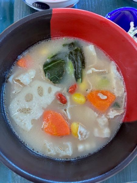 青菜、豚肉、にんじん、れんこん、などいつものお野菜のほか、銀杏、白クラゲ、クコの実など具沢山。