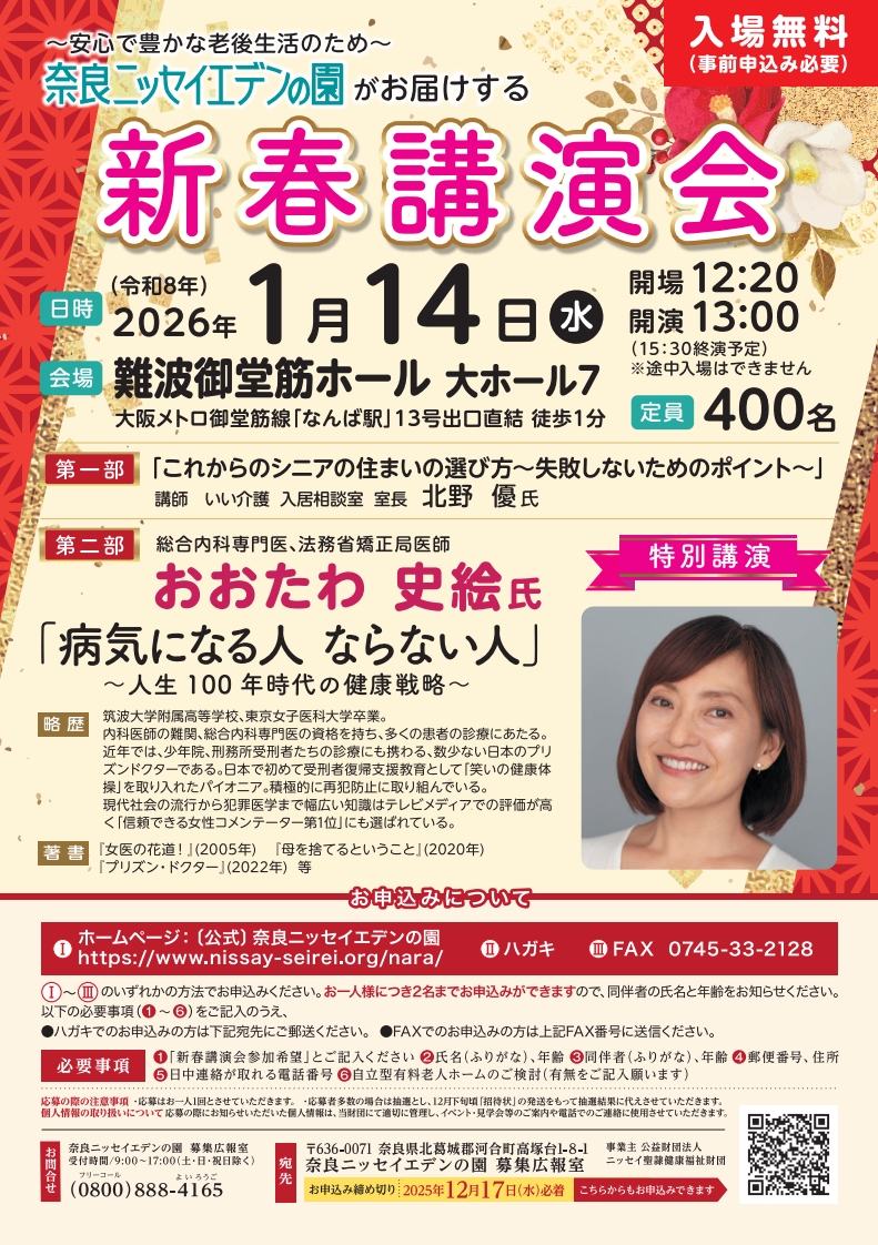 ①「新春講演会参加希望」とご記入ください。②氏名(ふりがな)、年齢