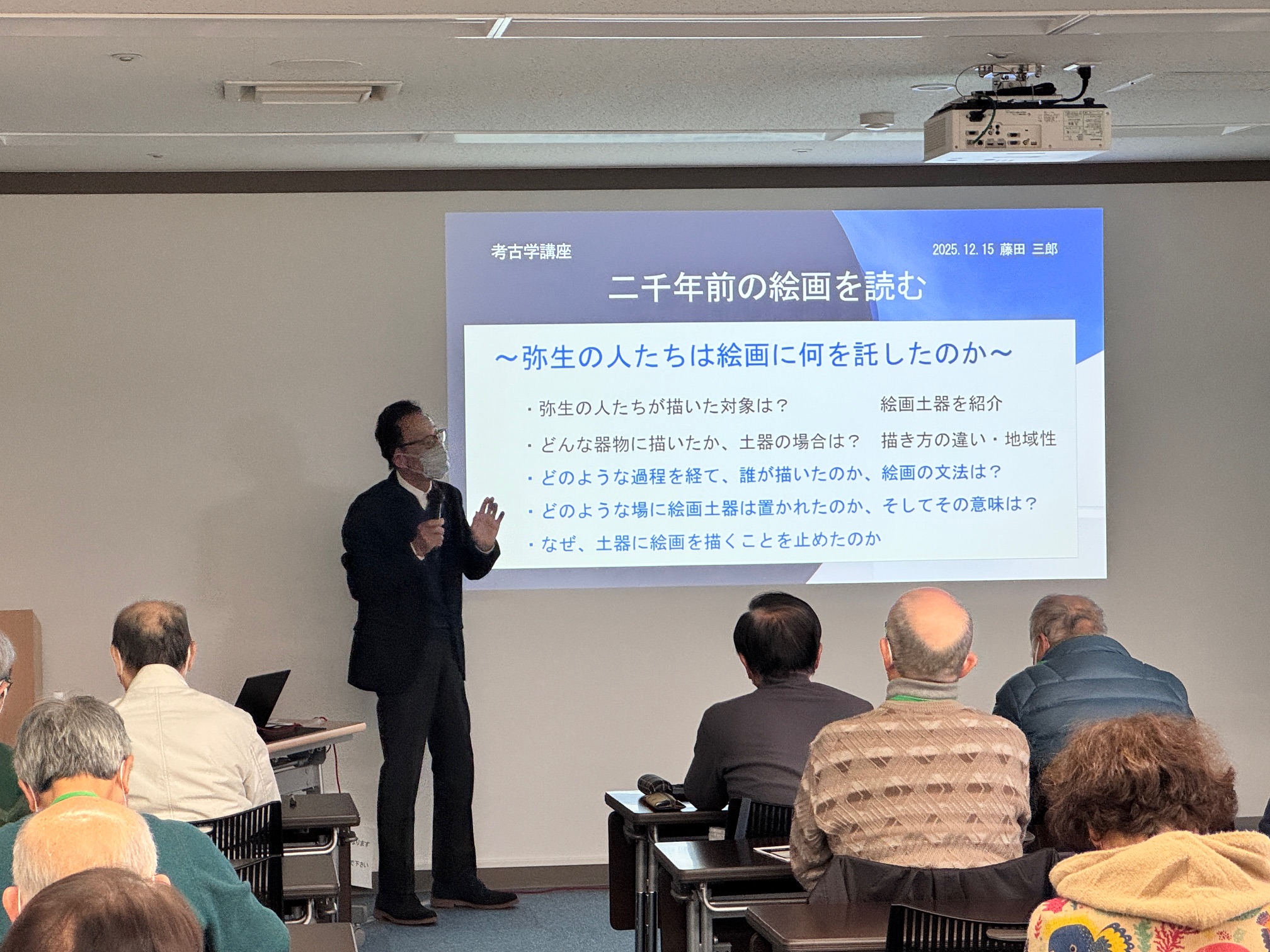 藤田三郎先生の考古学講座は昨年に続き、2回目となります。今回は、「二千年前の絵画を読む」~弥生の人たちは絵画に何を託したのか~というテーマでお話しをいただきました。