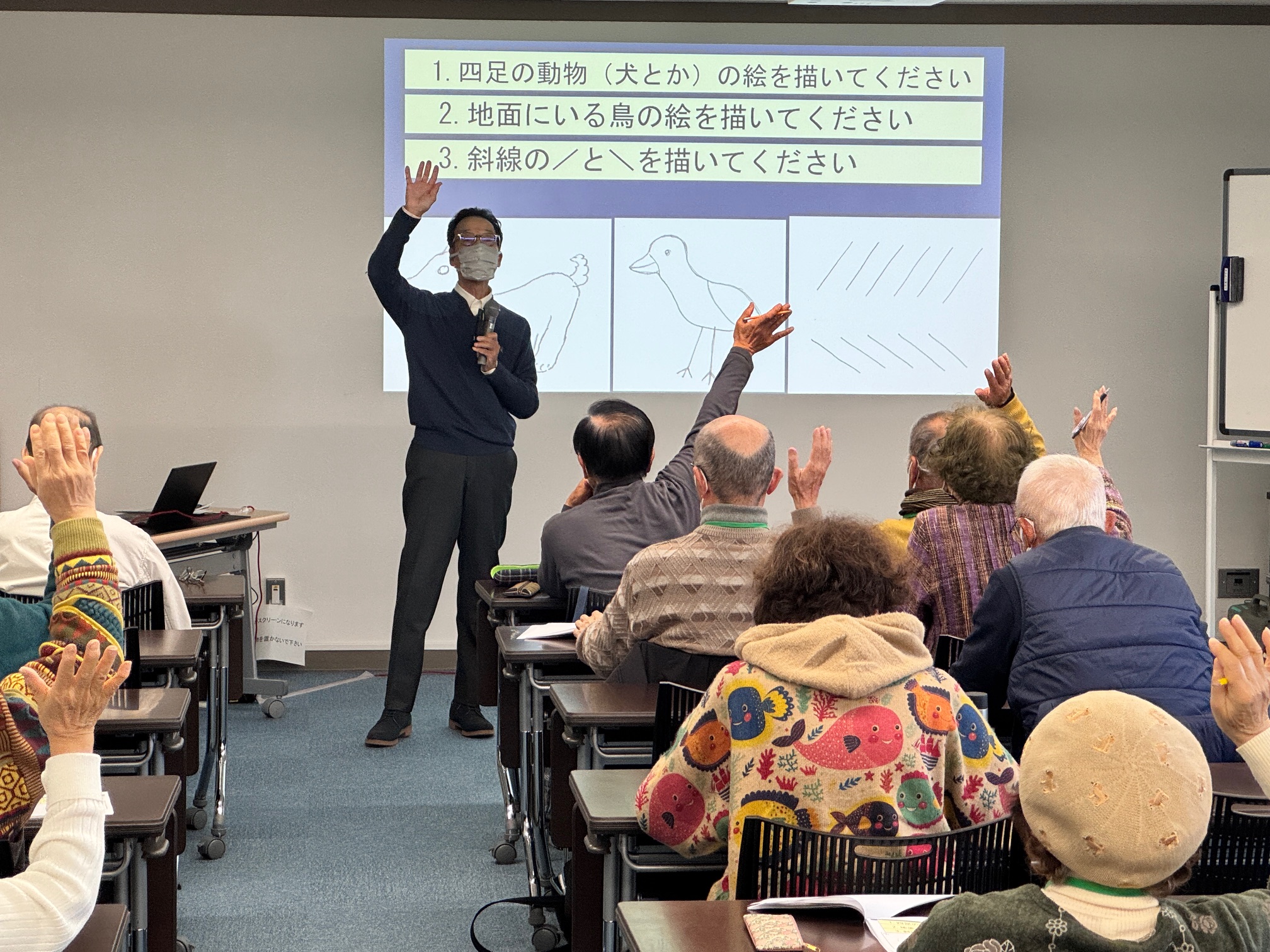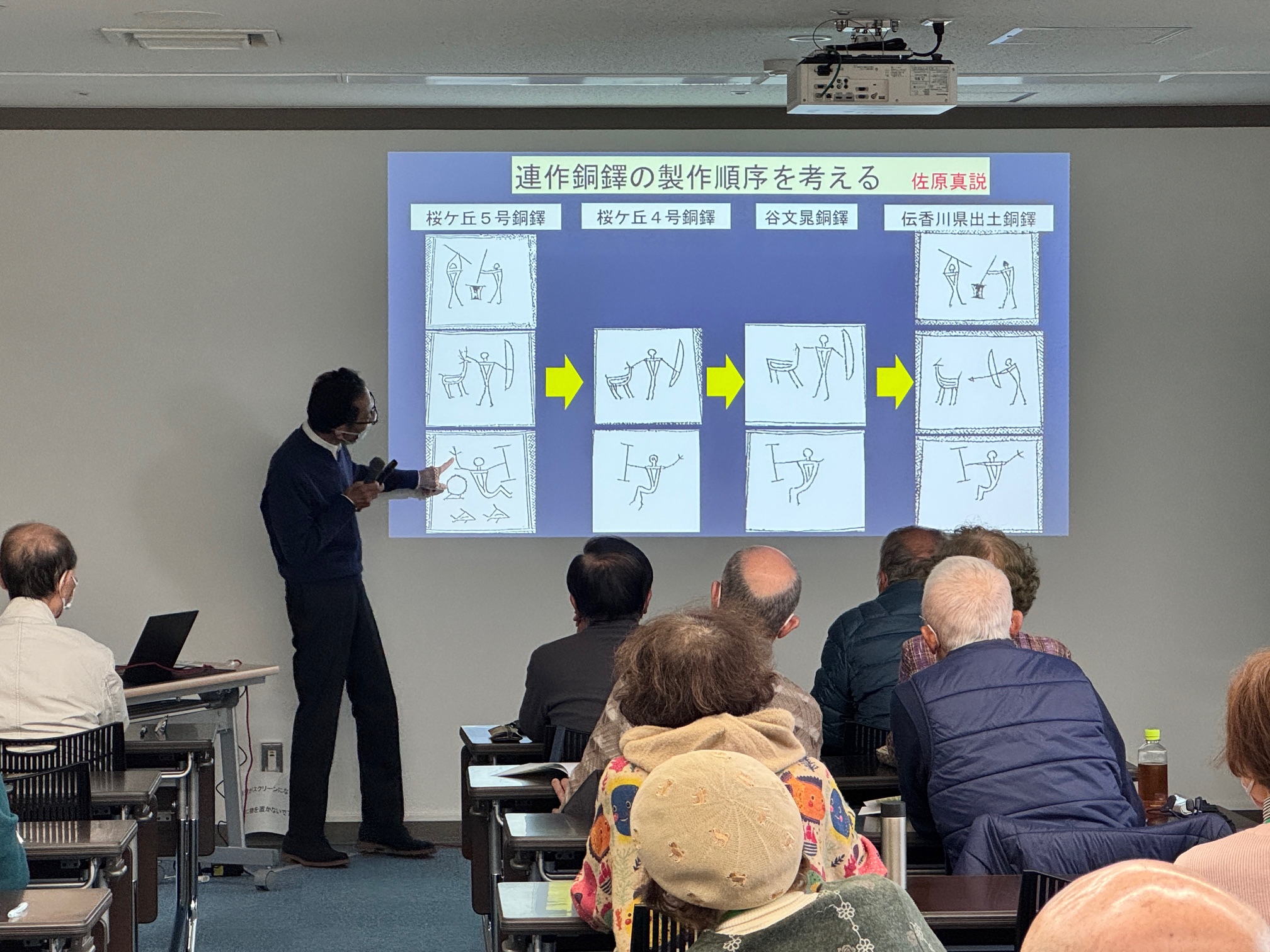 二千年前の弥生時代の人たちが土器に刻んだ建物や人物、鹿、魚など、シンプルな表現ではあるものの、それらを細部まで細かく観察することで、その絵画が何を表現しているのかを徐々に読み解いていけるというお話を、スライドで具体例を示しながら詳しく教えていただきました。「細部に神は宿る」という言葉通り、足の向きひとつで絵画の表す状況が推測でき、ヘラを入れる向きに注目することで描いた人の利き手が右利きなのか左利きなのかを判別することができる、などのお話にご参加者の皆さんは大きく頷きながら熱心に聞いておられました。
