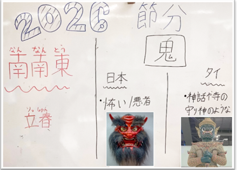 今回はタイ出身の職員が、日本とタイの鬼の違いについてイラストを交えてご利用の皆さまにお話しをさせていただきました。