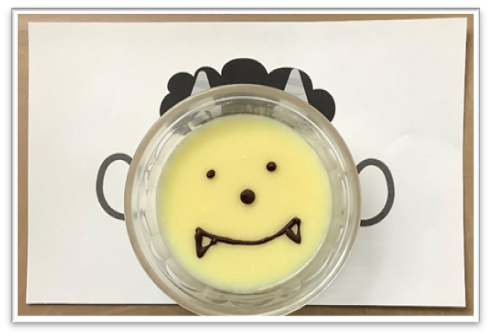 プリンに、職員がチョコペンで鬼の顔を描き、ご利用者の皆さまに楽しんでいただきました✍