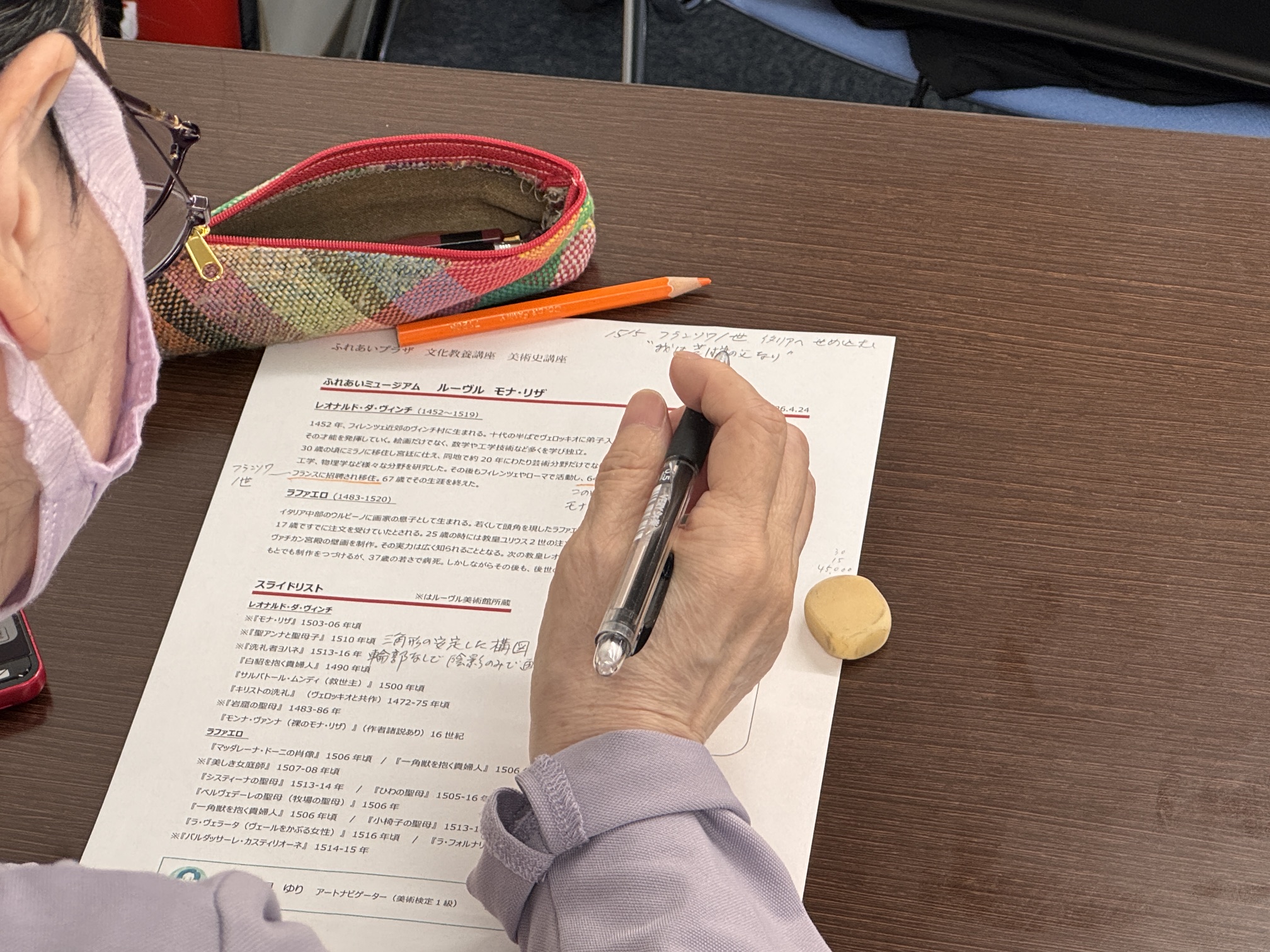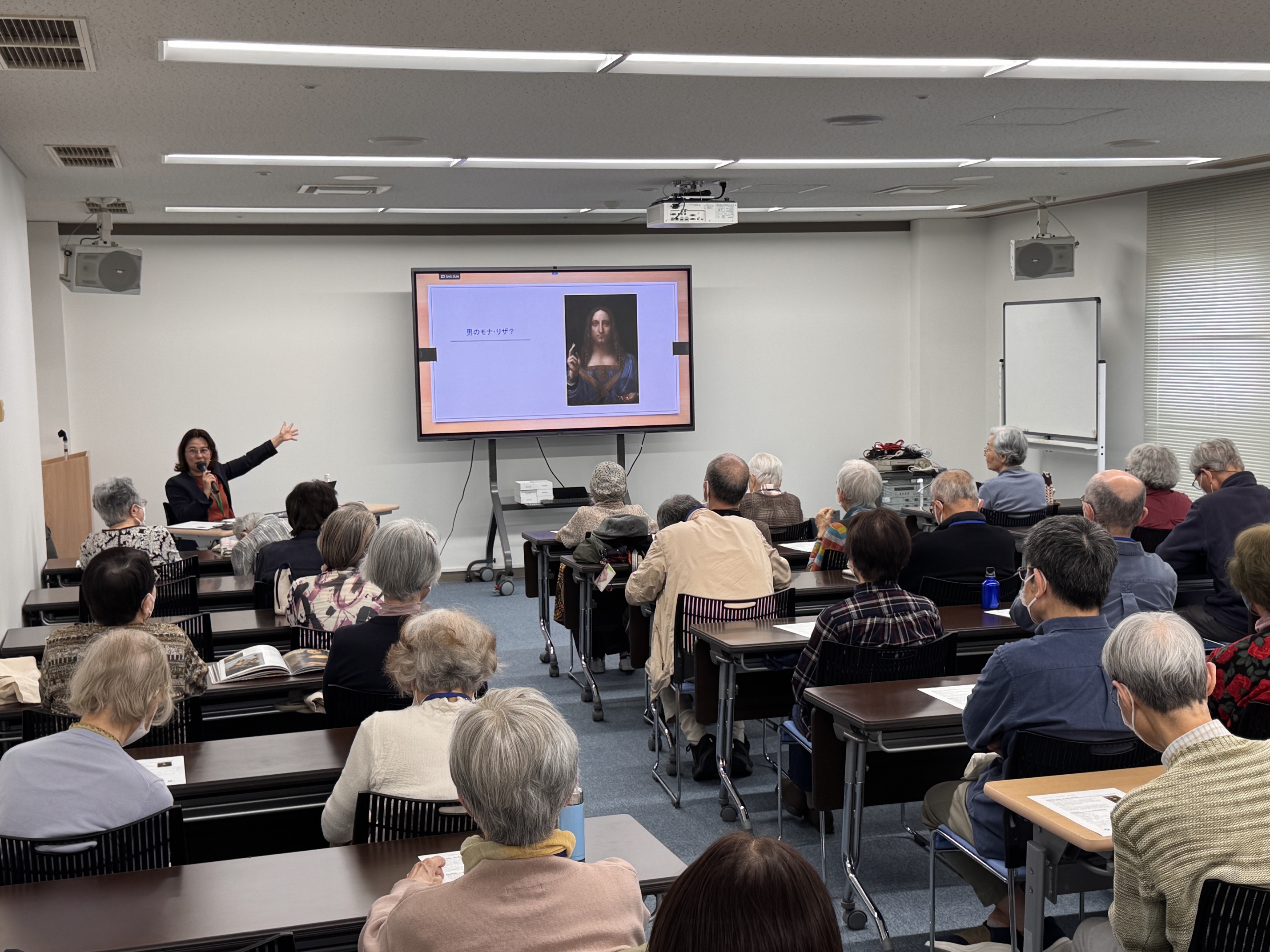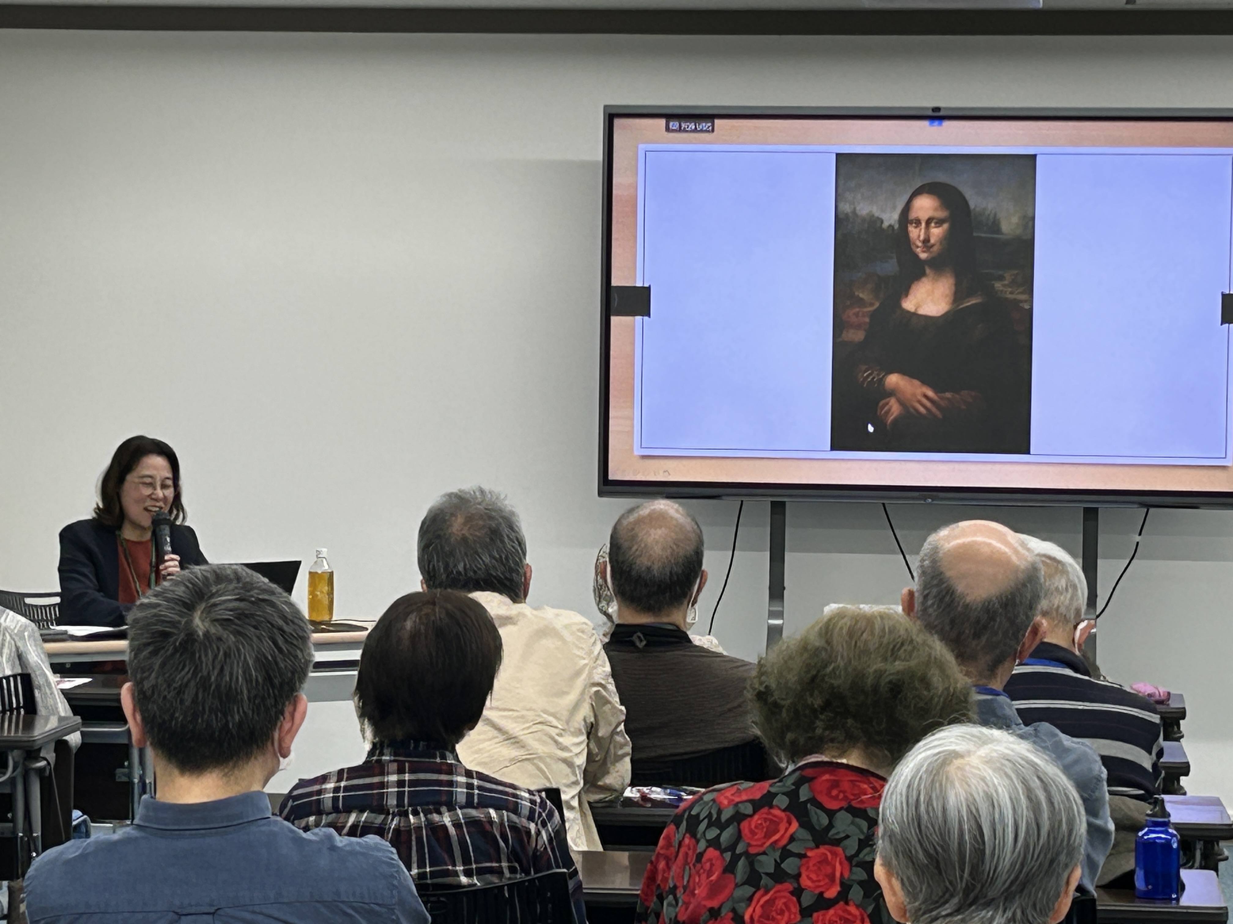 イタリアの巨匠レオナルド・ダ・ヴィンチの作品が何故フランスのルーヴル美術館にあるのか、モナ・リザのモデルは結局誰なのか?、モナ・リザの表情は本当に微笑んでいるのか?など、琴見先生の柔らかい笑顔と豊富な知識に裏付けされた興味深いお話に、参加者の皆さんは驚きの声を出されて身を乗り出され聞き入っておられました。